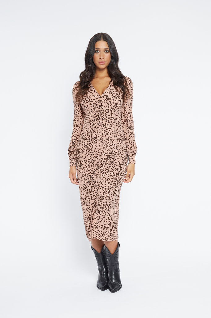 This pink panther print dress falls well below the knee and has a brown panther print on a light salmon pink dress. The maxi dress has a v neck. From this v-neckline vertical buttons run to the bottom of the dress. These buttons are made of the same material and pattern as the dress itself. The same goes for the buttons at the ends of the sleeves. The sleeves of this pink dress are very slightly taken in at the top, creating a light puffed sleeve. The pink dress has a pink underskirt for comfort. The back of the maxi dress closes with a vertical zipper that is incorporated in the fabric in such a way that you cannot see it.
