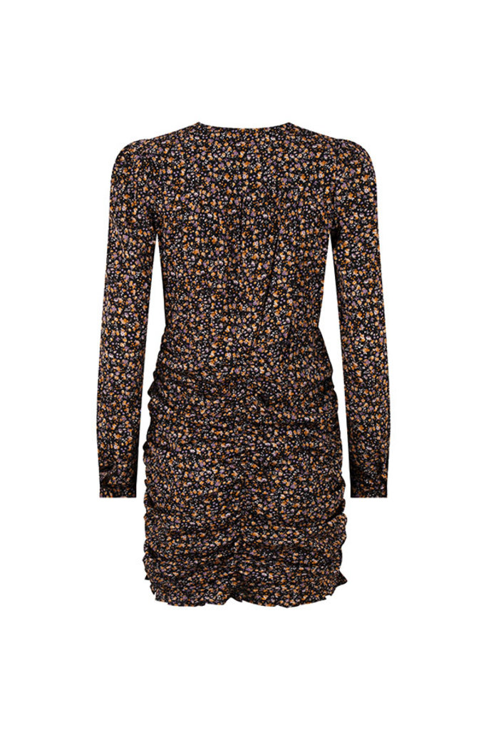 Flower print dress Marianne has a dark base with a pattern of small floral items in purple, yellow and off white. The mini dress has a casual fit. The romantic look is emphasized by the vertical seam that runs at the front and back and creates beautiful pleats from the waist down. The v-neck dress has a small puff effect on the shoulders. The long sleeves close with 1 button. The polyester mini dress has a zipper on the side and a soft black lining.