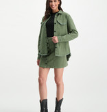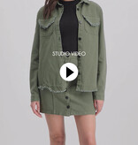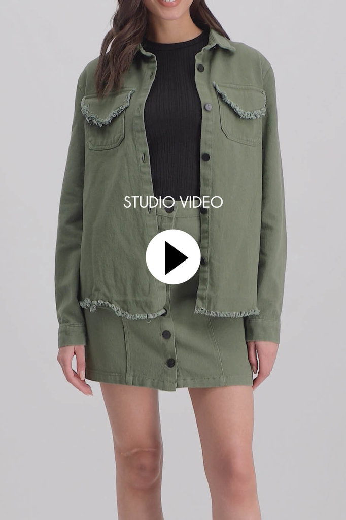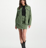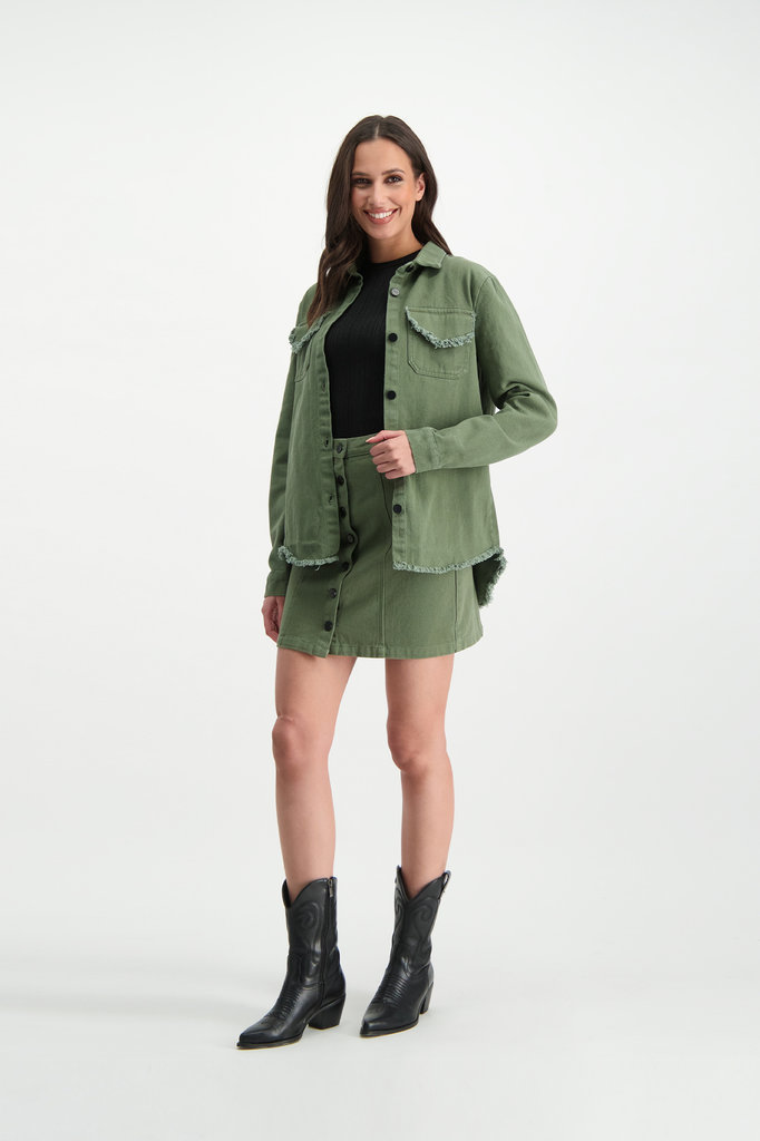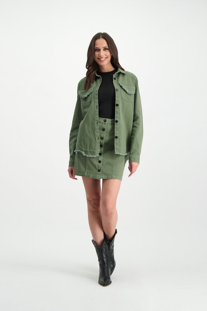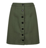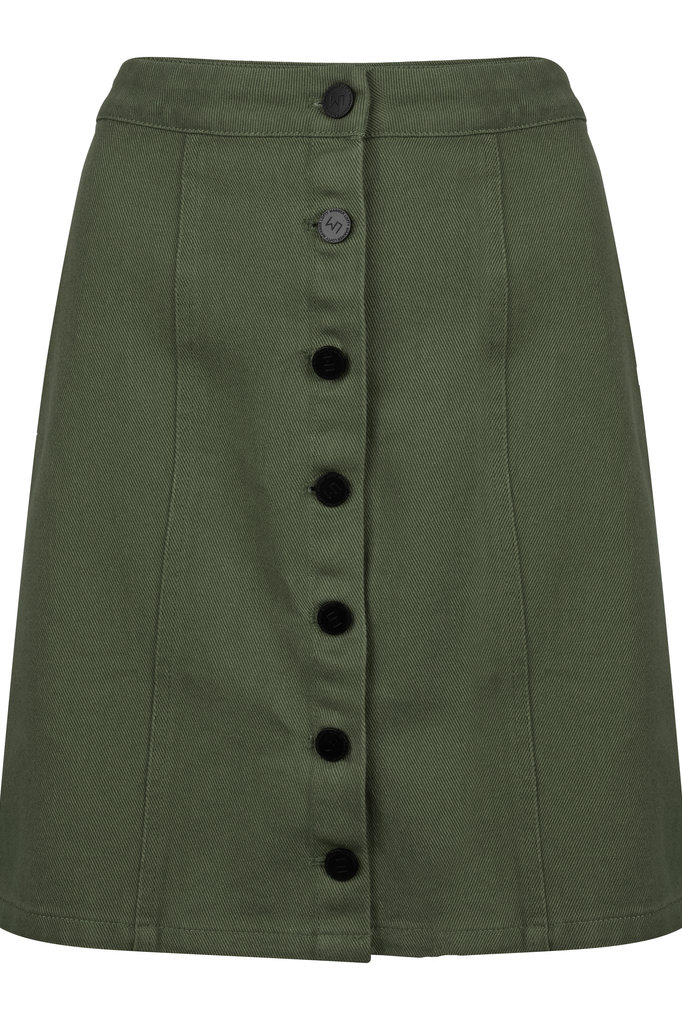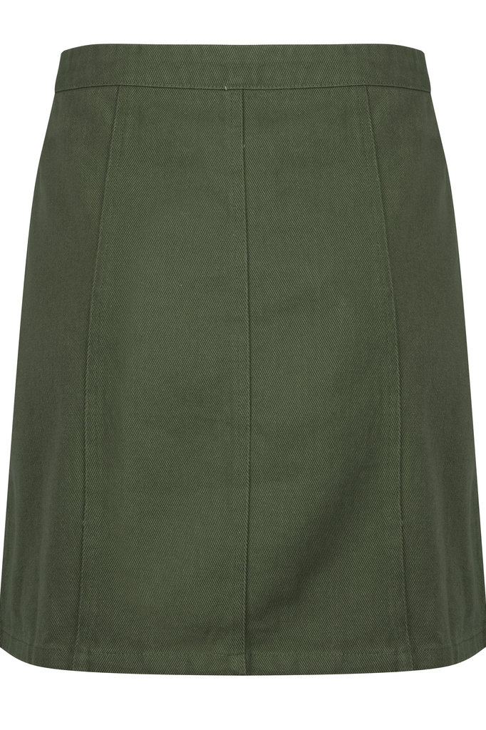 This dark green skirt gives you that real autumn feel. The green skirt closes with black buttons that run vertically at the front. The denim skirt has stitching on the front which gives the mini skirt that extra touch.