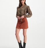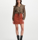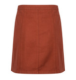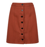 This rusty brown skirt gives you that real autumn feel. The skirt closes with black buttons that run vertically at the front. The denim skirt has stitching on the front which gives the mini skirt that extra touch.