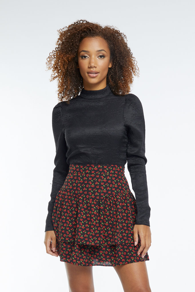Deze zwarte top is gemaakt van een hele bijzondere stof: texturized met verticale lijnen en een abstract motief van kleine japanse bloemetjes. Deze top heeft een romantisch effect, wat nog extra wordt versterkt door de A-lijn en de hoge ronde hals. De zwarte top sluit aan de achterkant met een klein ritsje wat onzichtbaar is door de stof die er overheen valt. Om de klassieke eenvoud te benadrukken lopen de mouwen van de black top recht.
